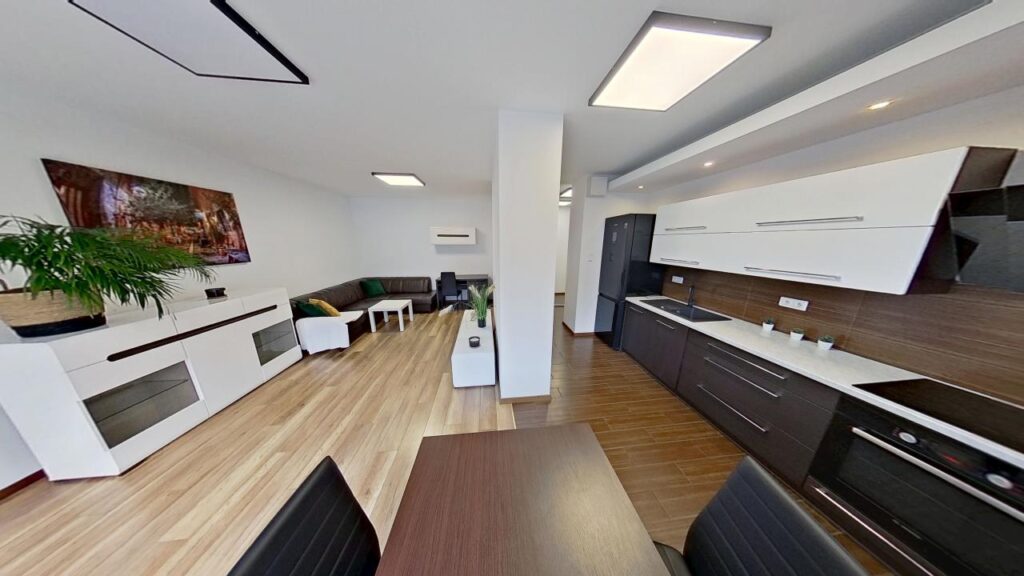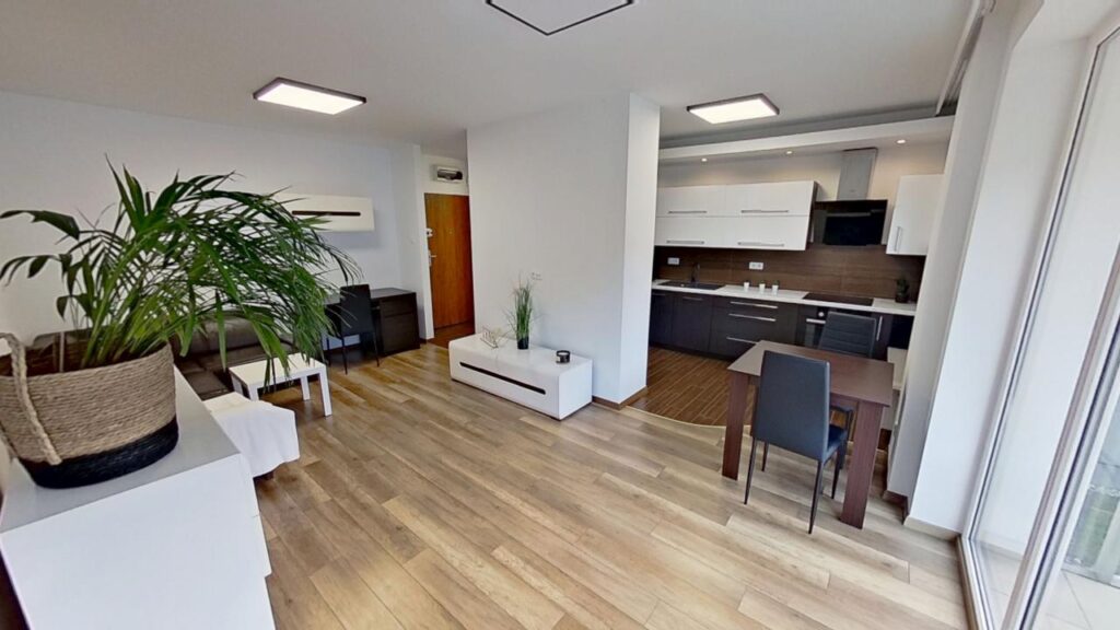 Mieszkanie jest przestronne, ciepłe, funkcjonalne i ciche. W pełni wyposażone nie tylko w meble ale posiadające także, osobną garderobę. Aneks kuchenny w zabudowie ze sprzętem AGD. Salon i sypialnia, wyposażone w duże okna, które zapewniają doświetlenie pomieszczeń. Salon posiada wyjście na przyjemny i funkcjonalny balkon.