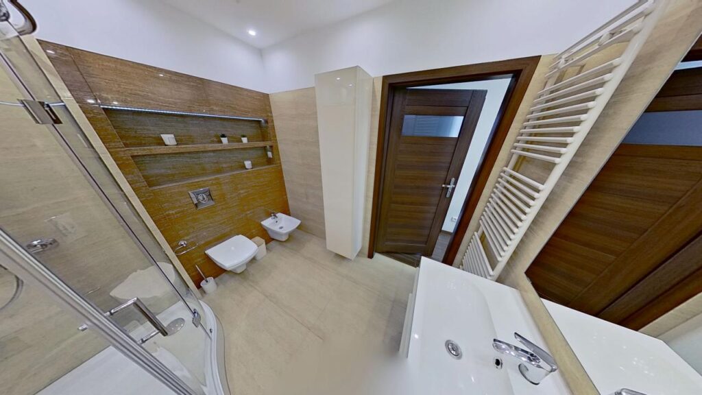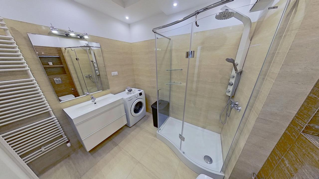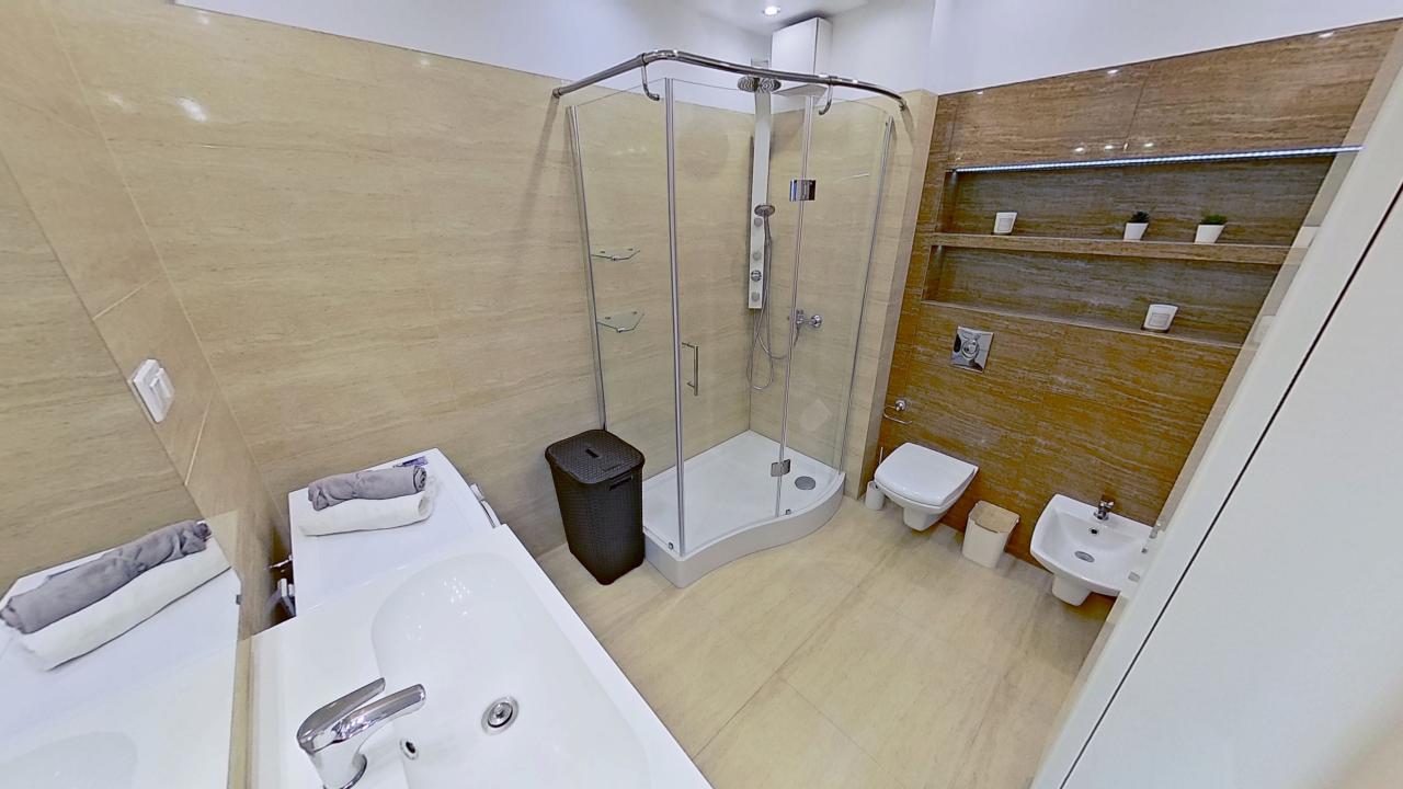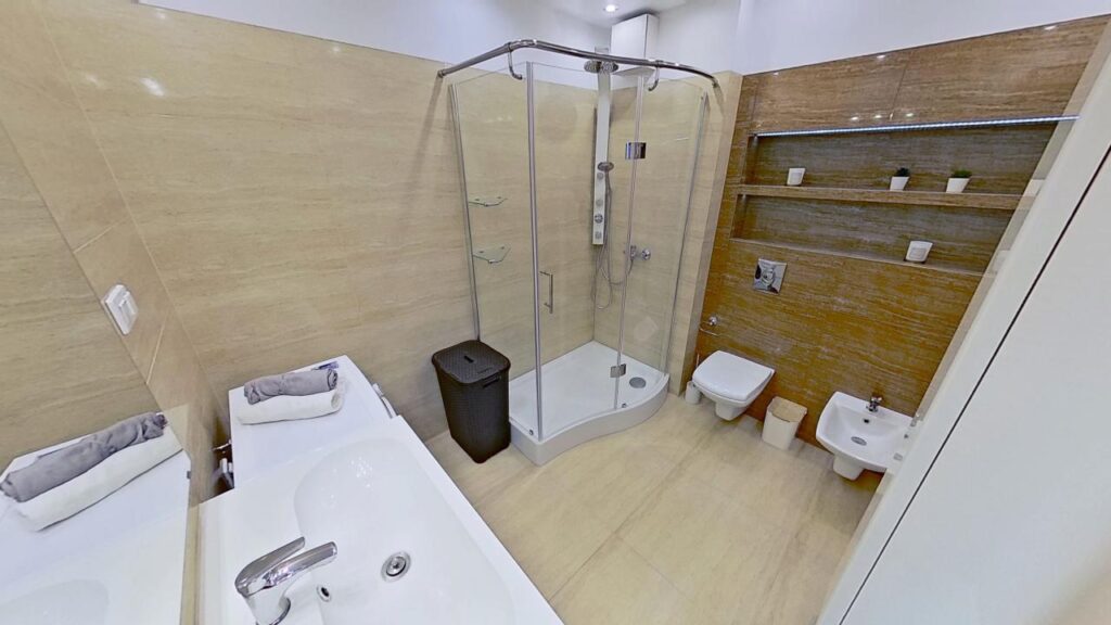 – łazienka z prysznicem, wc, bidetem i umywalką,